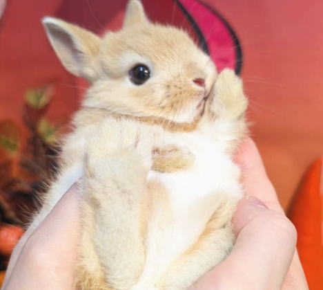 小さなサイズの立ち耳うさぎです。 愛くるしい容姿は絵本の主人公ピーターラビットを想像させます。 大人になると体重は 850g ~ 1.2 kg 程度になります。 体型は普通サイズです。形の良い丸い頭とお顔をしています♪ 大人しい甘えっ子。^^ 抱っこは嫌がりません。 近くに行くとすぐに寄ってきてくれて、とっても可愛いです。 (*^ ^*) お顔の真横にある丸い大きなお目々、丸いおでこ、 厚くて形の良いお耳、幅のある丸い体型、 キレイなオレンジ色のコートがチャームポイント! 生きているぬいぐるみみたいな、可愛らしいベビーちゃんをお探しのパパ、ママにピッタリ!オススメです。(o^^o)v インスタグラム ママとベビーちゃん達の動画です |