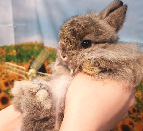長毛種の中で1番小さなサイズの立ち耳うさぎです。 小型種に多い、怖がり、神経質な性格が少なく人懐こい子が多いです。 大人になると体重は 1.2g ~ 1.6 kg 程度になります。 体型は大変小柄です。大きな頭とお顔が可愛らしいベビーちゃんです。 大人しい、甘えっ子。抱っこは嫌がりません。 近くに行くとそろーっと寄ってきてくれます。 毛量があってボリュームタップリですが、毛の長さが程良く、 毛質が良いのでお手入れには手がかからないと思っています。 お顔の真横にあるまん丸なトビキリ大きなお目々、 形の良い短いお耳、ホワホワなおでこと ほっぺの飾り毛がタップリあるとこがチャームポイント! 画像より実際の方がずーっと可愛いように思います (^_^; ちっこい生きているぬいぐるみのように可愛らしいベビーちゃんをお探しのパパ、ママにピッタリ!おススメです。(o^^o)v インスタグラム ママとベビーちゃん達の動画です | |||